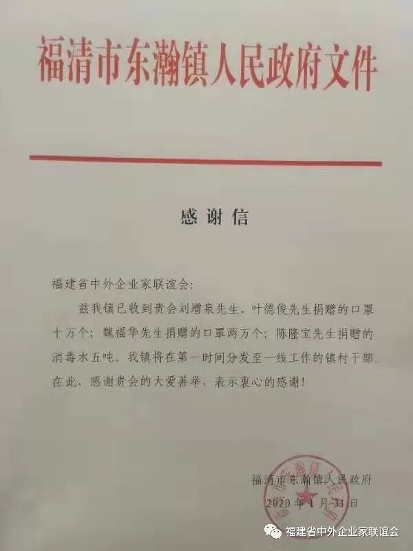 ————在此次抗击疫情的捐款活动中,涌现出许多感人事迹。有的会员企业家身兼多个社会职务,已在其他商协会或是其他渠道捐款,但依旧积极响应联谊会的捐款倡议,在第一时间再次筹款;在国内抗疫物资紧缺的情况下,有的会员企业家充分发挥自身优势,发动海外闽籍侨胞迅速行动起来,慷慨解囊,在全球范围内购买医用口罩、医用护目镜、防护服、防护手套等物资,联谊会主动作为找物流运输及接受主体的正式官方通道,将所急需物资及时送达;有的会员企业根据自身业务特点,制定了公益法律咨询计划,成立公益法律服务志愿团,为企业及个人提供专业法律服务,主动为广大企业排忧解难。截止2月26日,为抗击疫情筹款:福清自贸区委员会筹款155000元(定向捐赠),柬埔寨福建总商会筹款33万元(定向捐赠),盼盼食品认捐2000万元(定向捐赠),口罩35万个(定向捐赠);联谊会筹款781637元。后续筹款筹物仍在进行中,企业家们以勇于担当的闽商精神,体现责任担当,写满闽商大爱。